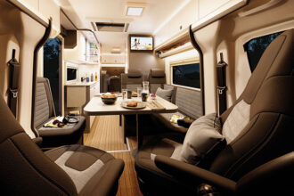 Firma Carado wprowadziła w tym roku kilka ciekawych pojazdów. Carado T135 to kompaktowa półintegra, w której opcjonalne, opuszczane łóżko zapewnia dodatkowe miejsce do spania, choć cały pojazd ma mniej niż sześć metrów. Model Carado T328 zyskał bardziej przestronny salon dzięki przesuniętej łazience i kuchni; producent oferuje też opcję dodatkowego fotela z tyłu oraz duży, 137‑litrowy zbiornik na żywność. Z kolei Carado V347 (van) posiada innowacyjne łóżko składane na ścianę, które nie ogranicza wysokości wejścia – w dzień wnętrze przypomina przestronny salon, a nocą zmienia się w sypialnię dla czterech osób.